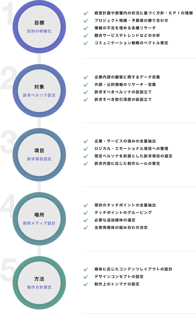 5つの観点から、企業・サービスの「訴求方針」、「対象ユーザー」、「最適な手法」などを選定していきます。