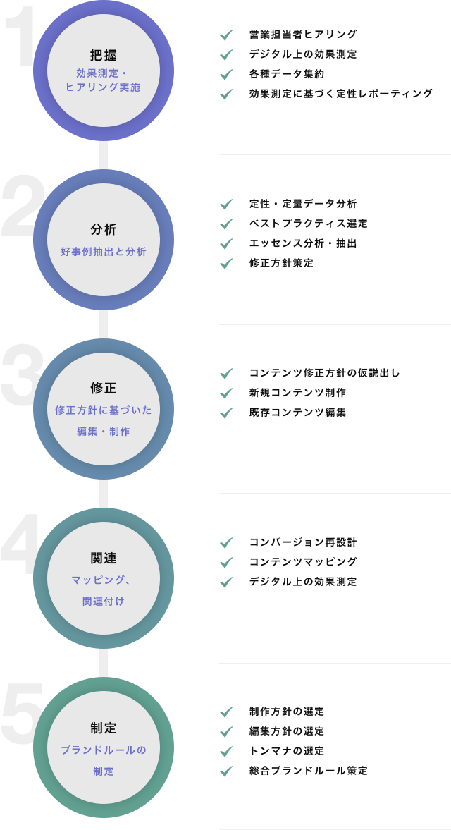 企業コミュニケーション戦略が最適に実現されているかを効果検証し、コンテンツ・営業ツール群のさらなるアップデートや新規制作、使用方法の具体化を図ります。